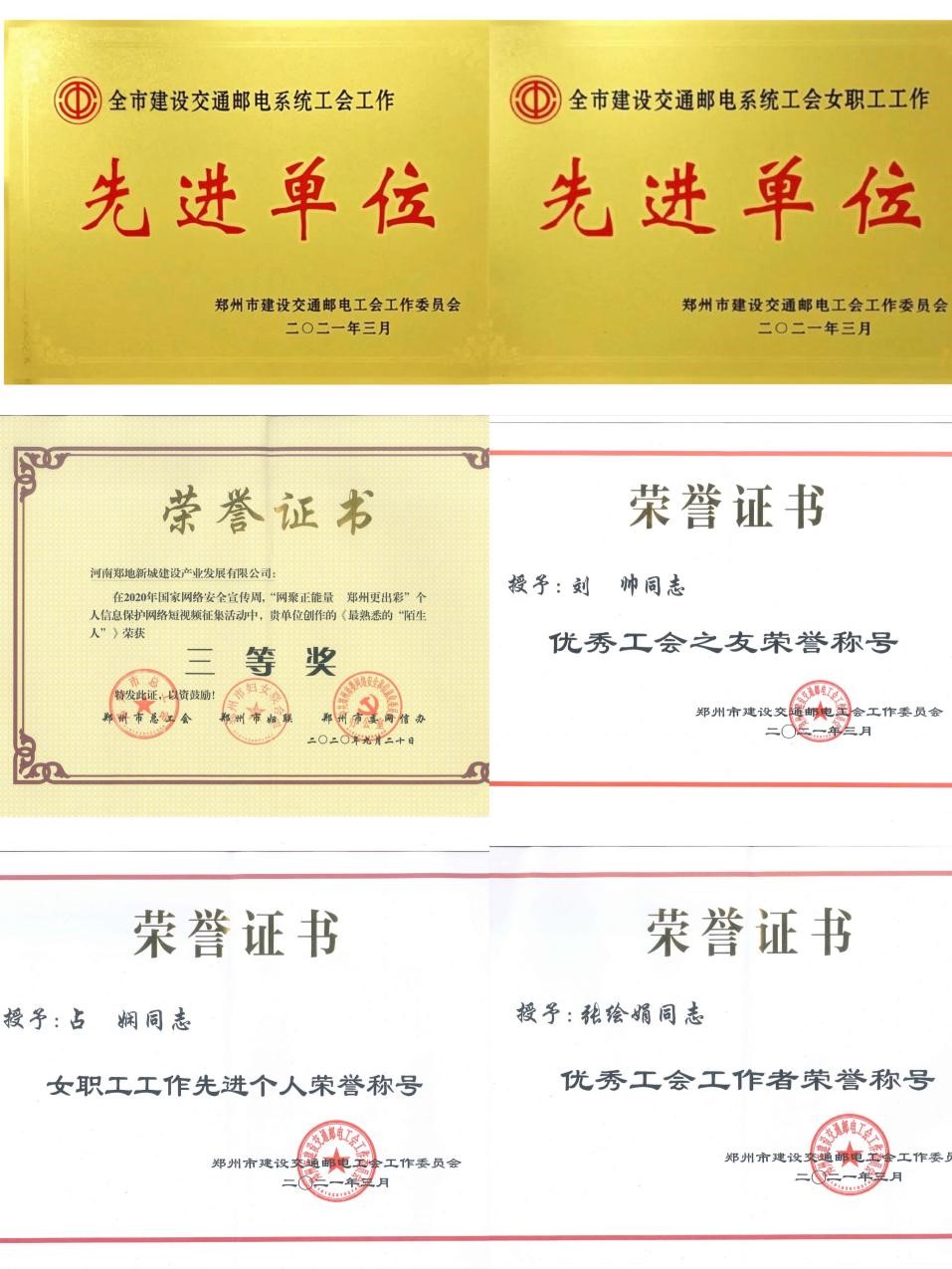 2021年3月22日,經(jīng)鄭州市建設(shè)交通郵電工會工作委員會研究決定,授予我公司工會鄭州市建設(shè)交通郵電系統(tǒng)“2020年度工會工作先進單位”和“2020年度女職工工作先進單位”榮譽稱號,并授予劉帥同志鄭州市建設(shè)交通郵電系統(tǒng)“2020年度工會之友”榮譽稱號,新城公司工會的占嫻和張繪娟兩位同志分別被評選為“優(yōu)秀工會女職工工作”和“優(yōu)秀工會工作者”先進個人。