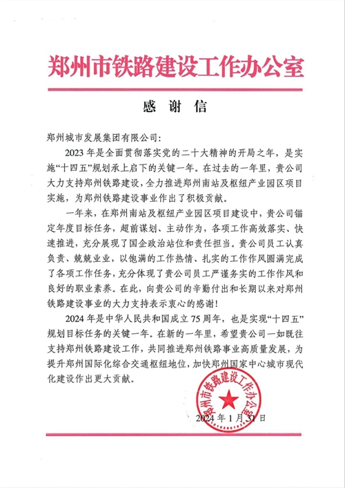同時(shí),城發(fā)集團(tuán)大力支持鄭州鐵路建設(shè),全力推進(jìn)鄭州南站及樞紐產(chǎn)業(yè)園項(xiàng)目實(shí)施,超前謀劃、主動(dòng)作為,各項(xiàng)工作高效落實(shí)、快速推進(jìn),充分展現(xiàn)了國企政治站位和責(zé)任擔(dān)當(dāng)。做一件好事,添一份美麗 ,再收到鄭州市鐵路建設(shè)工作辦公室的感謝信!