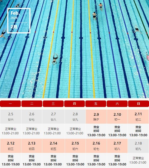 游泳館春節(jié)假期營(yíng)業(yè)時(shí)間: