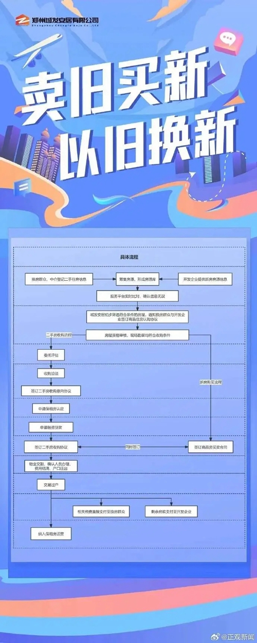 鄭州房產(chǎn)市場(chǎng)“賣舊買新、以舊換新”旨在滿足群眾改善性住房需求。具體來(lái)講,由政府指定收購(gòu)主體—鄭州城市發(fā)展集團(tuán)有限公司與具有改善需求的換房群眾進(jìn)行洽談,通過(guò)價(jià)格評(píng)估、銀行貸款等一系列工作流程,收購(gòu)群眾二手房源,為群眾購(gòu)買新房提供資金支持,暢通買賣渠道。此外,群眾也可通過(guò)市場(chǎng)化方式進(jìn)行交易。