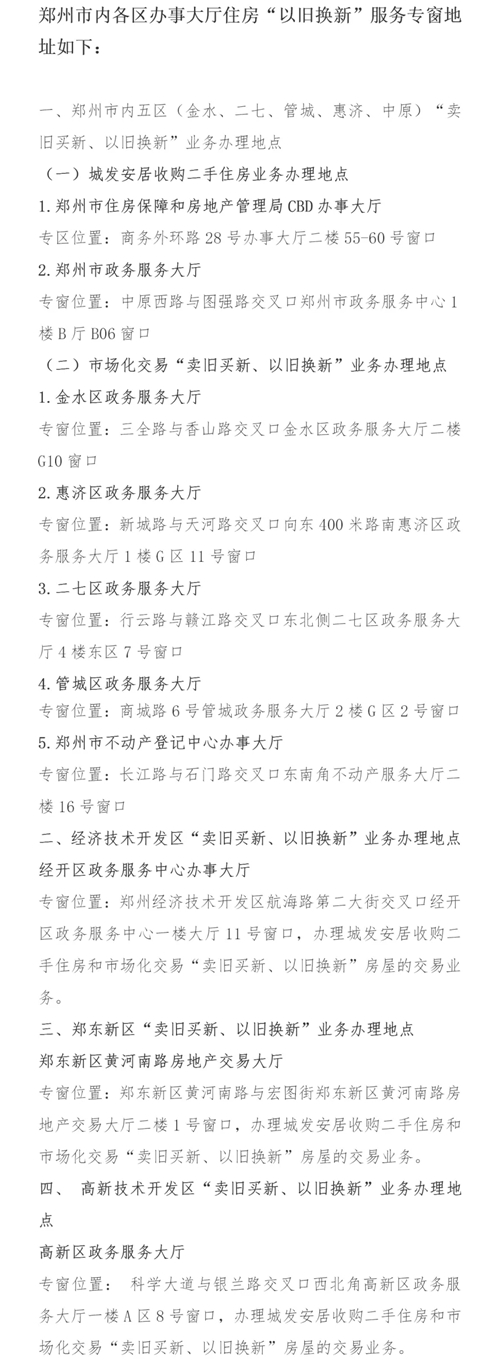 7月16日,記者從鄭州市房管局獲悉,為促進(jìn)該市房地產(chǎn)市場(chǎng)“賣(mài)舊買(mǎi)新、以舊換新”政策進(jìn)一步落實(shí),鄭州市房管局會(huì)同稅務(wù)、不動(dòng)產(chǎn)登記等部門(mén),認(rèn)真梳理工作流程、全面開(kāi)設(shè)服務(wù)專區(qū),全力推進(jìn)住房“以舊換新”工作。目前,鄭州市內(nèi)8區(qū)10個(gè)辦事大廳均開(kāi)設(shè)“以舊換新”服務(wù)專窗,辦理相關(guān)業(yè)務(wù)可享受“專人專窗”的服務(wù)。