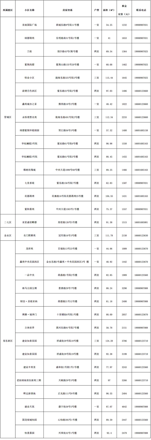 本批次配租房源共計(jì)32套(61間),其中鄭東新區(qū)15套(28間)、管城區(qū)15套(28間)、二七區(qū)1套(2間)、金水區(qū)1套(3間)。水電費(fèi)均為民用水電標(biāo)準(zhǔn),房源精裝修交付,周邊配套設(shè)施齊全,配備家具家電,拎包入住,后續(xù)房源將根據(jù)裝修進(jìn)度情況陸續(xù)配租。運(yùn)營(yíng)單位為鄭州城發(fā)安居有限公司。聯(lián)系電話:4001261666。
