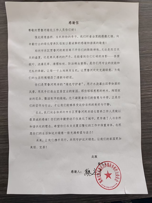 守護(hù)賈魯河的生態(tài)之美,是綠化養(yǎng)護(hù)人矢志不渝的責(zé)任與光榮使命。每一片蔥郁的樹林、每一處綻放的花海、每一聲清脆的鳥鳴,都見證著養(yǎng)護(hù)團(tuán)隊(duì)的匠心與堅(jiān)守。此次收到鄭東新區(qū)崗李村村委的錦旗和感謝信,令全體團(tuán)隊(duì)倍感鼓舞。這不僅是對(duì)養(yǎng)護(hù)團(tuán)隊(duì)專業(yè)能力的認(rèn)可,更是對(duì)賈魯河生態(tài)治理成效的高度肯定。