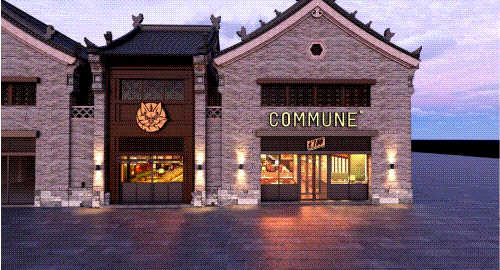 以COMMUNE幻師的門店設計為例——從效果圖可以看出,建筑外部以青灰色磚墻復刻商代建筑肌理,檐角神獸造型融入現(xiàn)代燈光設計,整體風格充滿著古樸與時尚。店內則以暖色調營造松弛感,酒墻擺滿了來自全球的精釀。每當味蕾觸碰到精釀的麥香,窗外同時飄入來自3600年前夯土的氣息——在這里,顧客喝的不是單純的酒,而是歷史與現(xiàn)代的奇妙敘事。