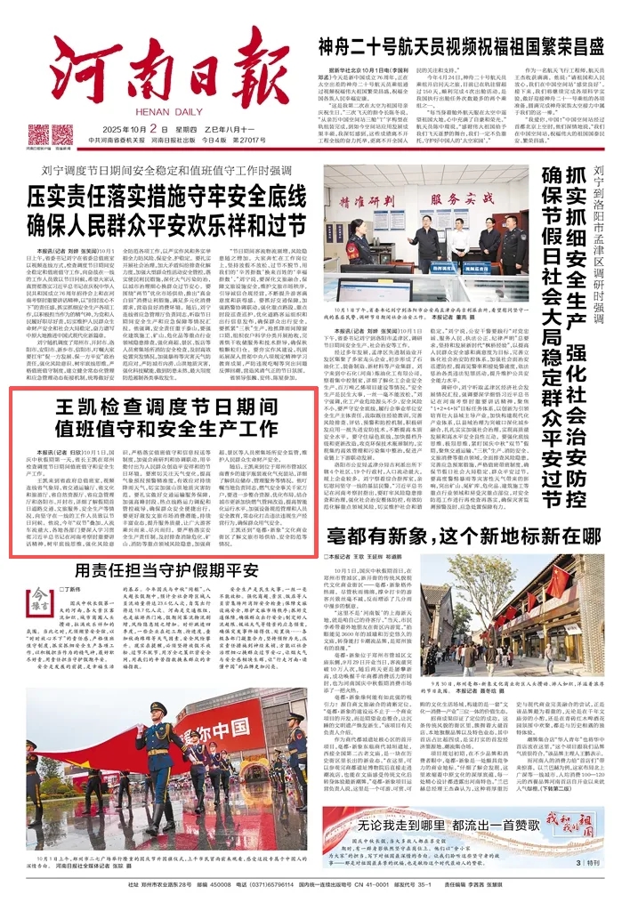 王凱來到省政府總值班室,視頻連線省氣象局、省交通運(yùn)輸廳、省文化和旅游廳、省自然資源廳、省應(yīng)急管理廳和洛陽市、開封市,詳細(xì)了解假期首日道路交通、文旅服務(wù)、安全生產(chǎn)等情況,向堅(jiān)守在一線的工作人員致以節(jié)日問候。他說,今年“雙節(jié)”疊加,人流車流量大,各地各部門要深入學(xué)習(xí)貫徹習(xí)近平總書記在河南考察時(shí)重要講話精神,樹牢底線思維,強(qiáng)化風(fēng)險(xiǎn)意識(shí),嚴(yán)格落實(shí)值班值守和信息報(bào)送等制度,加強(qiáng)會(huì)商研判和協(xié)調(diào)聯(lián)動(dòng),用辛勤付出為人民群眾創(chuàng)造平安祥和的節(jié)日環(huán)境。要密切關(guān)注天氣變化,提高氣象預(yù)報(bào)預(yù)警精準(zhǔn)度,有效應(yīng)對持續(xù)降雨天氣,切實(shí)加強(qiáng)山洪地質(zhì)災(zāi)害防范。要扎實(shí)做好交通運(yùn)輸服務(wù)保障,加強(qiáng)高峰時(shí)段、熱點(diǎn)線路運(yùn)力調(diào)配和管控疏導(dǎo),確保群眾安全便捷出行。要更好激發(fā)文旅市場消費(fèi)潛能,持續(xù)豐富業(yè)態(tài),提升服務(wù)質(zhì)量,讓廣大游客乘興而來、盡興而歸。要嚴(yán)格落實(shí)安全生產(chǎn)責(zé)任制,及時(shí)排查消除危化、礦山、消防等重點(diǎn)領(lǐng)域風(fēng)險(xiǎn)隱患,加強(qiáng)商超、景區(qū)等人員密集場所安全監(jiān)管,維護(hù)人民群眾生命財(cái)產(chǎn)安全。