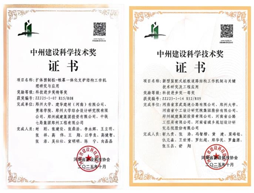 鄭州城建集團的“擴體預制樁—帷幕一體化支護結(jié)構(gòu)工作機理研究與應用”與“新型裝配式樁板道路結(jié)構(gòu)工作機制與關(guān)鍵技術(shù)研究及工程應用”兩項科研項目,分獲河南省“中州建設(shè)科學技術(shù)獎”特等獎和一等獎。