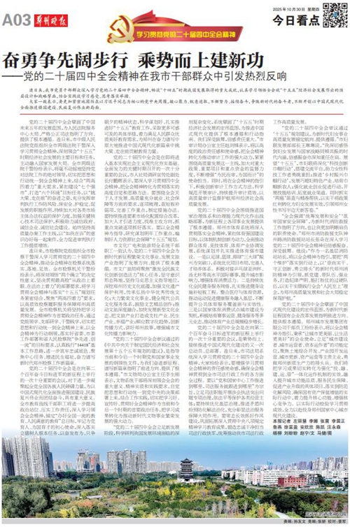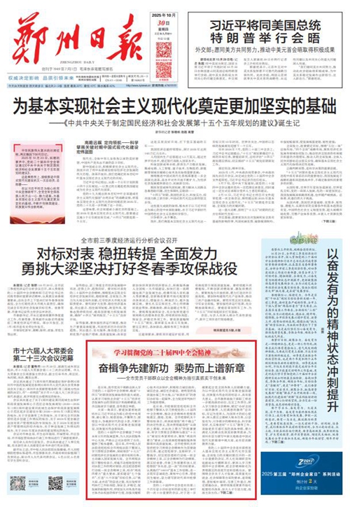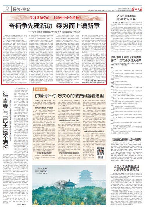 黨的二十屆四中全會(huì)擘畫(huà)了中國(guó)式現(xiàn)代化建設(shè)的宏偉藍(lán)圖,為新時(shí)代新征程國(guó)有企業(yè)改革發(fā)展指明前進(jìn)方向、提供根本遵循,鄭州城發(fā)集團(tuán)廣大黨員干部群眾深受鼓舞、倍感振奮。近日,《鄭州日?qǐng)?bào)》《鄭州晚報(bào)》開(kāi)設(shè)了【學(xué)習(xí)貫徹黨的二十屆四中全會(huì)精神】專欄,2025年10月30日,報(bào)道了鄭州城發(fā)集團(tuán)深入學(xué)習(xí)貫徹落實(shí)黨的二十屆四中全會(huì)精神,以全會(huì)精神為指引真抓實(shí)干創(chuàng)未來(lái)。