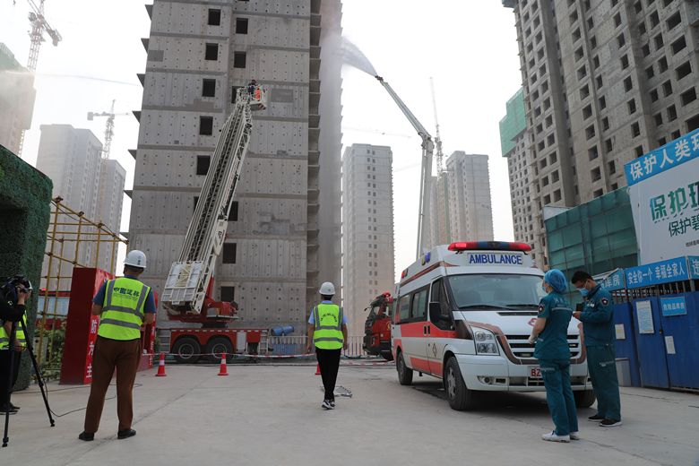 啟動(dòng)儀式上,在工地現(xiàn)場開展了消防救援應(yīng)急演練。該環(huán)節(jié)模擬施工現(xiàn)場發(fā)生火災(zāi)時(shí),現(xiàn)場管理人員應(yīng)急操作反應(yīng)及配合市消防救援支隊(duì)展開滅火救援的案例。演練現(xiàn)場火災(zāi)模擬真實(shí)生動(dòng),4部消防車、1部救援車、1部救護(hù)車實(shí)地奔赴現(xiàn)場開展滅火及救援。整個(gè)演練過程現(xiàn)場組織嚴(yán)密、人員到位快速、操作程序得當(dāng),達(dá)到了預(yù)期效果。宣誓環(huán)節(jié),由中建二局三公司代表引領(lǐng)各參賽單位代表共同開展安全宣誓。趙新中為各參賽單位授旗。