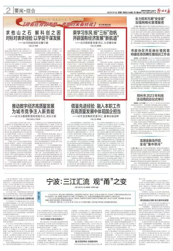 5月18日,《鄭州日?qǐng)?bào)》刊發(fā)市國資委黨委書記、主任曹東鋒專訪文章《乘學(xué)習(xí)東風(fēng) 揚(yáng)“三標(biāo)”勁帆 開辟國有經(jīng)濟(jì)發(fā)展“新航道”》,為您全文分享如下——